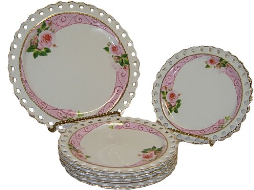 Discount 7-Piece Serving Plate Set for 6 with golden floral design with heart shaped rim, Pittilon Pink Rose Modello Fine Porcelain Set